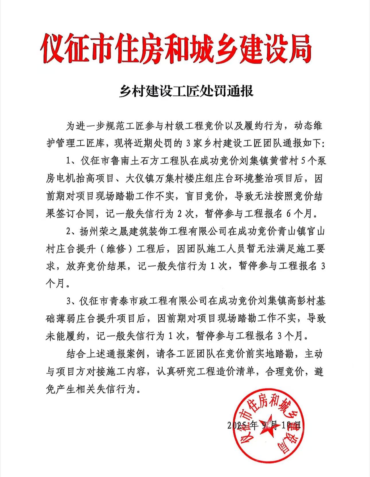 乡村建设工匠处罚通报