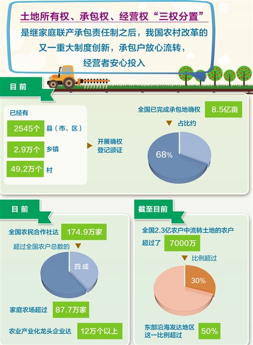 “70后”不愿种地、“80后”不会种地、“90后”不提种地,破解“谁来种地”难题是农村土地制度改革的重要方面。土地适度规模经营成为一把钥匙。目前,全国农民合作社达174.9万家,超过全国农户总数的四成。家庭农场超过87.7万家,农业产业化龙头企业达12万个以上。“家庭农场+社会化服务”“种粮大户+合作社”“合作社+龙头企业”等新型经营方式在各地涌现。